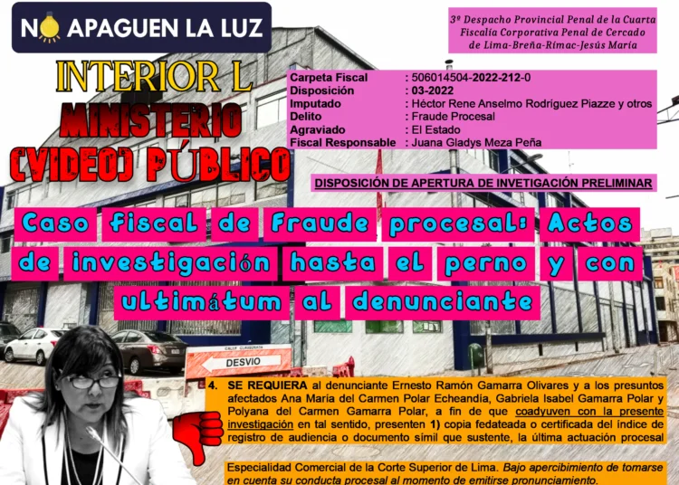 La disposición fiscal titulada “DISPOSICIÓN DE APERTURA DE INVETIGACIÓN PRELIMINAR”, que surgió luego de que la fiscalía superior declarada fundado el respectivo recurso de requerimiento de elevación de actuados, de autoría de la fiscal provincial penal y todavía titular, Juana Gladys MEZA PEÑA, del 1 de abril de 2022 es de terror y es para salir corriendo en todas las direcciones. Resulta difícil creer que esa disposición fiscal haya salido de las oficinas de una fiscal que ha hecho carrera en el Ministerio Público desde hace 35 años y a pesar de ello omita tomar la declaración del presunto autor intelectual del Fraude procesal, nos referimos a Héctor René Anselmo RODRÍGUEZ PIAZZE, y no contenta con ello requiera al denunciante y a las presuntas agraviadas presenten copias certificadas de las principales resoluciones del Exp. n.° 8737-2012 “bajo apercibimiento de tomarse en cuenta su conducta procesal al momento de emitirse pronunciamiento”, amén de que les requirió también copia fedateada o certificada del índice de audiencia o documento símil que sustente la última actuación procesal formal de los denunciados en el proceso de tercería de propiedad y hasta copia certificada o fedateada legible que sustente que los denunciados hayan actuado de manera formal en la audiencia. Cuando todo esto pudo requerirlo directamente al juzgado o a quien tenga el expediente. En cambio pide al juzgado que informe si para la emisión de una resolución “detectó o advirtió la originalidad o adulteración del documento consistente en contrato de dación en pago” como si el caso se tratara de falsificación de documentos o peor: como si estuviera dentro de las competencias del juzgado o de la sala detectar la autenticidad de los documentos a no ser que también hagan de peritos o investigadores y nosotros ni enterados. Y que si las litigantes (las agraviadas por el fraude procesal) han requerido al juzgado copias por motivo de la presunta comisión del delito de fraude procesal o más jodido todavía: ¡que informe las razones de la omisión de denuncia! Es decir las agraviadas están al filo de ser las imputadas. Todo este cúmulo de diligencias de la fiscal de marras deja un sabor amargo en este caso Rodríguez Piazze – Villamar y desanima a cualquiera que quisiese presentar una denuncia penal por el delito de Fraude procesal.