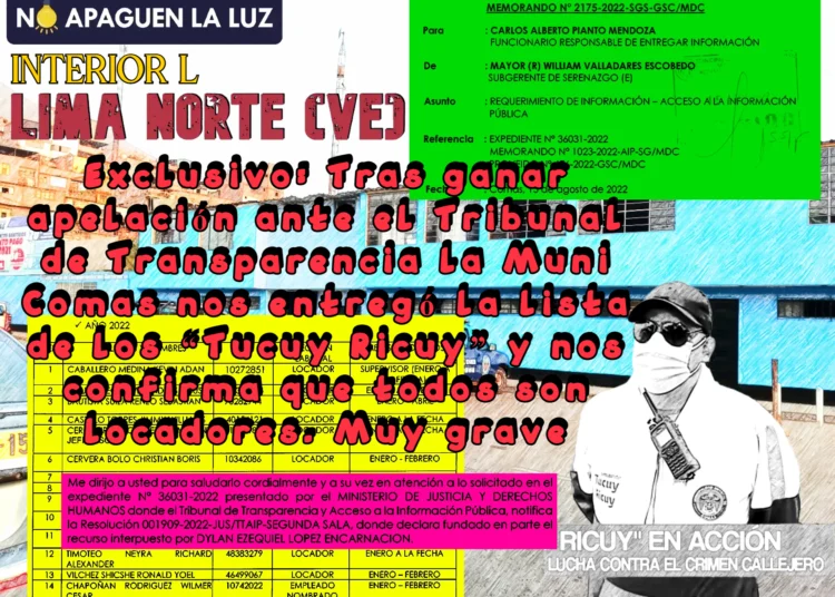 A diferencia de algunos mequetrefes que desde el anonimato se alucinan “periodistas” e intentaron, sin éxito y con roche, obtener documentos a través de regidoras procesadas por corrupción que ni pedir información saben, nosotros la peleamos ante el Tribunal de Transparencia y ganamos la apelación contra la Muni Comas luego de que su subgerente de Seguridad Ciudadana, William VALLADARES ESCOBEDO, se negara a entregar la lista de su mentado “comando especializado Tucuy Ricuy”. Es por ello que en esta edición especial publicamos en exclusiva para Uds. amigos lectores la lista oficial de los “comandos” Tucuy Ricuy y confirmamos, en base a ese documento público, que estos Tucuy Ricuy fueron contratados por la Municipalidad de Comas tanto para el 2021 como para el 2022 como locadores de servicio: su régimen laboral es la de un burdo locador. Lo cual de por sí está proscrito por ley (Ley n.° 31298), pero, para que el ciudadano de pie entienda, esta suerte de “ternas” del municipio de Comas o de comando paramilitar municipal no cuenta con seguro para sus “osadas” labores porque pregunta comeño ¿qué pasaría si en su intento por atrapar a un choro ranqueado este termina lastimando o hasta matando a un Tucuy Ricuy? Nada, sencillamente porque no tienen seguro y solo les quedaría demandar por una cuantiosa indemnización a la Muni Comas y los platos rotos los paga el sufrido pueblo comeño. Así están las cosas y hasta buenas fuentes nos confirman que algunos del Tucuy Ricuy dieron un paso al costado porque advirtieron que están haciendo de “ternas” sin armas y encima sin tener vínculo laboral con el municipio que le permita cubrir cualquier clase de “gaje del oficio”. Todo este destape se hace en medio de una retahíla de publycherrys de tradicionales canales de TV (Latina, Panamericana, etc.) que ya causan hartazgo y generan, más que seguridad en la población comeña, sospechas de que aquí corre plata del municipio para que estos “periodistas” le dediquen día y noche notas a estos Tucuy Ricuy. Aquí la nota y un saludo al joven promesa en Derecho Laboral, el sanmarquino Renato FARFÁN LORENZZI por darnos mayores luces sobre esto que es sintomático en los municipios: contratación, a diestra y siniestra, de locadores de servicio.