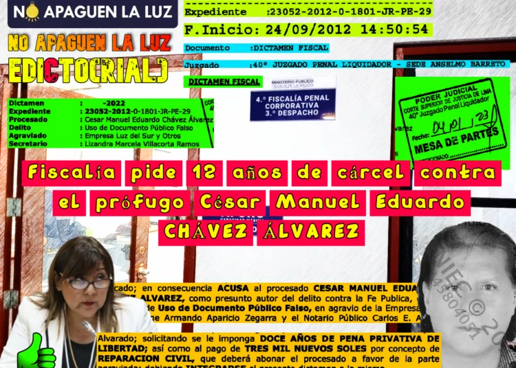 La fiscal Juana Gladys MEZA PEÑA, fiscal provincial penal titular del Tercer Despacho Provincial Penal de la Cuarta Fiscalía Corporativa Penal de Cercado de Lima – Breña – Rímac – Jesús María ha emitido dictamen acusatorio en el cual acusa a César Manuel Eduardo CHÁVEZ ÁLVAREZ, actual prófugo de la justicia nacional, como presunto autor del delito contra la Fe Pública en la modalidad de Uso de Documento Público Falso, en agravio de la Empresa Luz del Sur, Jorge Armando APARICIO ZEGARRA y el notario público Carlos Enrique AYALA ALVARADO y solicita se le imponga doce años de pena privativa de libertad; así como el pago de tres mil nuevos soles por concepto de reparación civil. El caso se resume a que este Chávez falsificó una carta poder legalizada notarialmente, específicamente falseó la firma del otorgante como la firma y sellos del notario, para poder negociar un descuento de pago de deuda sobre una casa en Miraflores con la empresa Luz del Sur. Esta es la segunda vez que se emite acusación penal en el proceso penal, pues el primer dictamen acusatorio salió el 8 de mayo de 2023 de la mano del fiscal José Federico CHIPANA LLANOS, fiscal provincial de la Vigésima Novena Fiscalía Provincial Penal de Lima, quien había solicitado cuatro (04) años de pena privativa de libertad y doscientos días multa además de fijar una reparación civil de 1000 nuevos soles. En su momento se llegó a emitir sentencia condenatoria pero fue declarada nula por una sala penal luego de que esta advirtiese que no se había emitido pronunciamiento sobre la excepción de prescripción, que recién después quedó enterrada conforme publicamos en una anterior ocasión. Bien, Dra. MEZA PEÑA, se hizo una con esta demoledora acusación fiscal. También cabe destacar la labor del abogado del agraviado Jorge Armando APARICIO ZEGARRA, Ernesto Ramón GAMARRA OLIVARES, quien a punta de escritos legales y peticiones verbales ha insistido con que se acuse al prófugo Chávez Álvarez.
