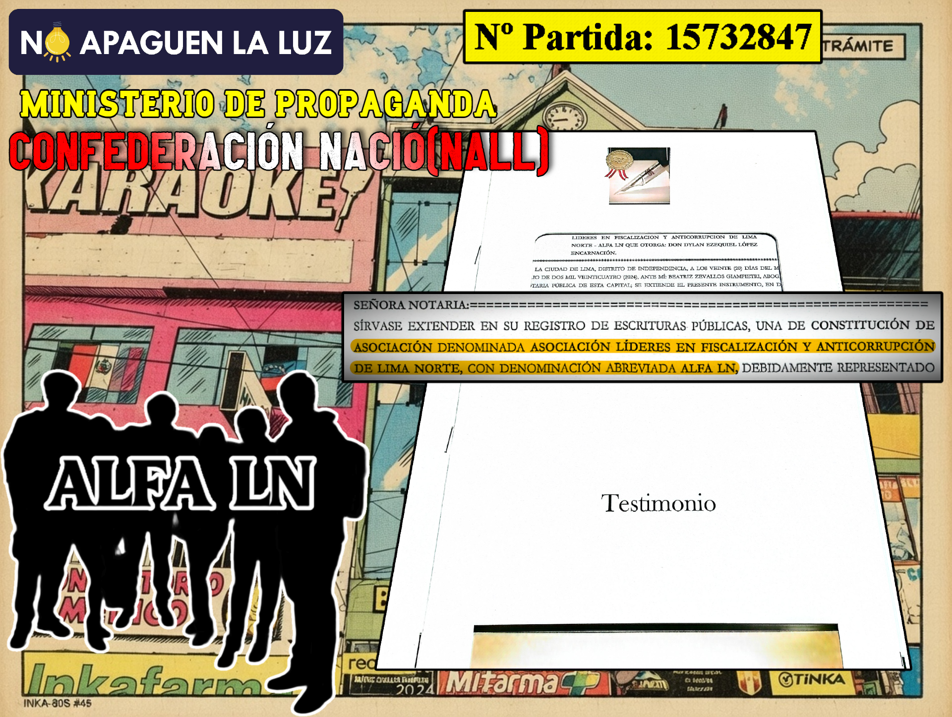 La inversión total para constituir ALFA LN ascendió a S/ 1570.50 (mil quinientos setenta soles con cincuenta céntimos) desde la separación del nombre ante SUNARP hasta las gestiones en la notaría de la Dra. Beatriz Ofelia ZEVALLOS GIAMPIETRI en el distrito de Independencia -cuyos precios y ubicación se hacía accesible para los seis- hasta la ansiada inscripción en el Registro de Personas Jurídicas de Lima de dicha superintendencia que aconteció un 6 de setiembre del 2024, obteniendo nuestra partida n.° 15732847. Sobre el nombre, fue selección entre los nombres sugeridos por este escriba quien tenía en mente el término “Líderes” y otros pero sin conseguir un acrónimo agradable, hasta que el vocal Brian la chuntó con la palabra “Anticorrupción”. Sobre el logo, fue un diseño hecho en Canva el secretario Piero, con observaciones y sugerencias de parte del resto del grupo.