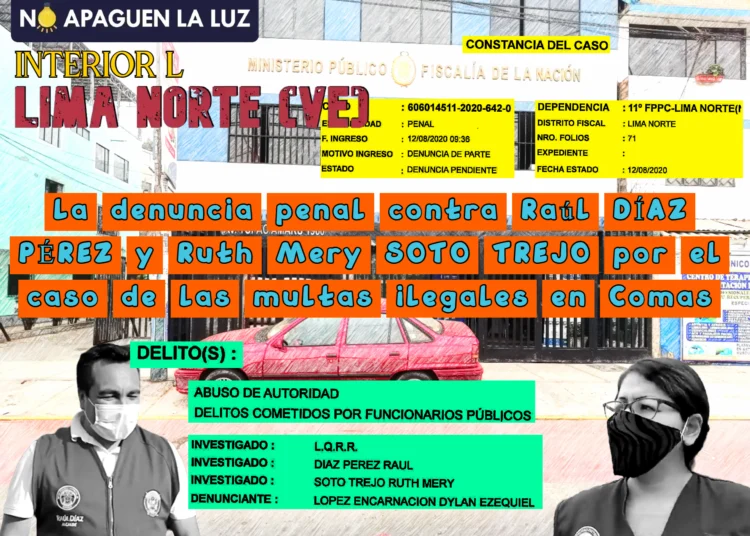 Esta nota fue publicada originalmente en nuestro anterior blog el 9 de agosto de 2020 (ver nota en este enlace), esta vez traemos la versión “remasterizada”. El viernes 7 de agosto de 2020, el equipo anónimo de No Apaguen La Luz presentó, utilizando nuestro correo Outlook dylanlopeze@hotmail.com, vía Mesa de Partes Virtual del Ministerio Público de Lima Norte (✉ penal.sanlazaro1@mpfn.gob.pe) la denuncia penal por el delito de Abuso de autoridad (art. 376 del Código Penal) y el delito de Falsedad ideológica (art. 428 del Código Penal) contra Raúl Díaz Pérez, en su condición de alcalde de Comas, Ruth Mery Soto Trejo, en su condición de gerenta de Fiscalización y Transporte, y contra los que resulten responsables (L.Q.R.R.) por haber impuesto multas utilizando una ordenanza municipal ¡derogada! (la Ord. n.° 515/MDC que fue muerta con la Ord. n.° 584/MDC) contra decenas de negocios locales y todavía en plena pandemia. Hasta la gerenta de marras se jactaba de haber participado en los “operativos” de clausuras temporales masivas de comercios pequeños y medianos de Comas. Nuestra tesis es de que tanto Díaz como Soto son los cabecillas de esta maquinaria de multas donde se desnaturalizó el sentido punitivo del régimen administrativo sancionador municipal y se convirtió en un modus operandi recaudador institucionalizado de marca Díaz Pérez-Soto Trejo. El tema es penal y está en el caso fiscal n.° 606014511-2020-642-0 a cargo del Segundo Despacho de la Décimo Primera Fiscalía Provincial Penal Corporativa de Lima Norte.