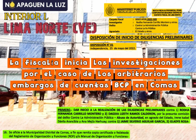 El 30 de abril de 2022 nos dimos la ocasión de presentar la correspondiente denuncia penal a la mesa de partes virtual del Ministerio Público de Lima Norte, especificamente el correo electrónico penal.sanlazaro4@mail.mpfn.gob.pe. Hay que destacar la valentía de tres señoras comeñas que aportaron con documentos y compromiso a esta denuncia penal: Irene Isabel DÁVILA ARANCIBIA, Ana MEJÍA HERHUAY y Ketty María ANGULO ORBE. Ellas valen un Perú y nos muestran que la voluntad para ponerle el parche a los fuleros de la administración pública trasciende condiciones económicas. También destacamos la colaboración del Dr. Víctor Hugo NÚÑEZ PAREDES (@vhnunezparedes1) quien colaboró con su visto bueno y firma en la denuncia penal. El contenido de la denuncia penal fue elaborado por el equipo anónimo de No Apaguen La Luz.