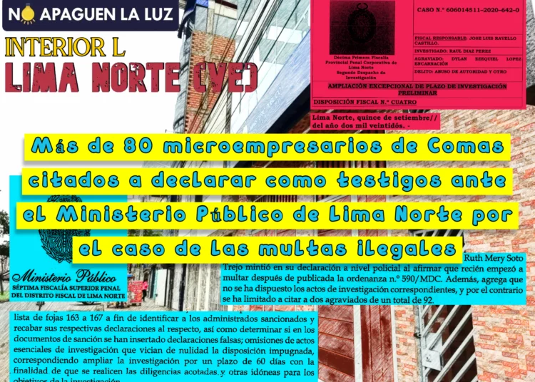 La Séptima Fiscalía Superior de Lima Norte a cargo del fiscal superior Basilio Francisco SAAVEDRA POSSO declaró fundado nuestro recurso de requerimiento de elevación de actuados contra la disposición fiscal de archivo mediante la cual el fiscal adjunto José RAVELLO CASTILLO del Segundo Despacho de la Décimo Primera Fiscalía Provincial Penal Corporativa de Lima Norte había archivado este caso de las multas ilegales en Comas. Así las cosas, esa disposición de archivo de autoría del fiscal Ravello y por tanto nula esta disposición que mandaba al archivo uno de los casos emblemáticos y patentes de la corrupta gestión de Raúl DÍAZ PÉREZ, pues cuando su gerenta de Fiscalización y Transporte, Ruth Mery SOTO TREJO (a) “la machete Trejo”, estaba al mando de todo lo que es fiscalización, varios fiscalizadores, los (im)populares “fiscas”, impusieron multas a diestra y siniestra, a la par de clausuras temporales por montones, a aproximadamente 92 negocios según fuentes oficiales y todo frente al visto bueno de Díaz y Soto quienes fácilmente pudieron declarar nulas esas multas y clausuras pero la vocación por el delito pudo más que por la vocación por el Derecho. Pues los fiscas aplicaron las multas y clausuras utilizando una ordenanza que los mismos Díaz y Soto habían mandado derogar, la Ord. 515/MDC que contenía el Reglamento de Aplicación y Sanciones (RAS) de la Muni Comas. El caso criminal que este humilde equipo anónimo de No Apaguen La Luz denunció, postuló los cargos de Abuso de autoridad y Falsedad ideológica. El primer delito dirigido contra el alcalde Raúl DÍAZ PÉREZ, la gerenta Ruth Mey SOTO TREJO y Los Que Resulten Responsables (L.Q.R.R.), por estar detrás de esta maquinaria recaudadora a punta de multas truchas y el segundo delito contra estos dos últimos por haber puesto en los famosos papelotes de clausurado (las notificaciones municipales de infracción o por sus siglas NMI) una ordenanza que ya estaba derogada. A raíz de la decisión del fiscal superior Saavedra, la fiscal Edith Josefina PACORA GRADOS dispuso citar a declarar en calidad de testigos a más de 80 empresarios justamente para acreditar la comisión de esos delitos, probablemente un hecho inédito en lo que respecta a las denuncias penales al menos en Lima Norte y que demuestra la magnitud del modus operandi de esta (di)gestión municipal que solo le queda este año. Este caso fue la primera señal de lo que se vendría después: abuso de autoridad a granel y en nombre de la “recaudación”. Es lo que permite entender el tan sonado caso de las grúas del cual nos avocaremos alguna vez.