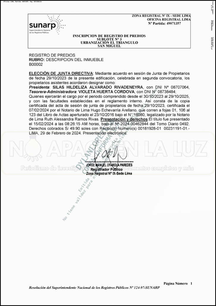 De hecho en la partida n.° 49071357 en el cual está inscrito el Conjunto Residencial “Faucett” del distrito de San Miguel, el año pasado se inscribió una junta directiva presidida por la presidenta Silas Hildeliza ALVARADO RIVADENEYRA y la tesorera-administradora Violeta HUERTA CÓRDOVA y no figura ni por asomo Vargas Ríos y los cuatro gatos que lo acompañan -o seis- en su asociación.