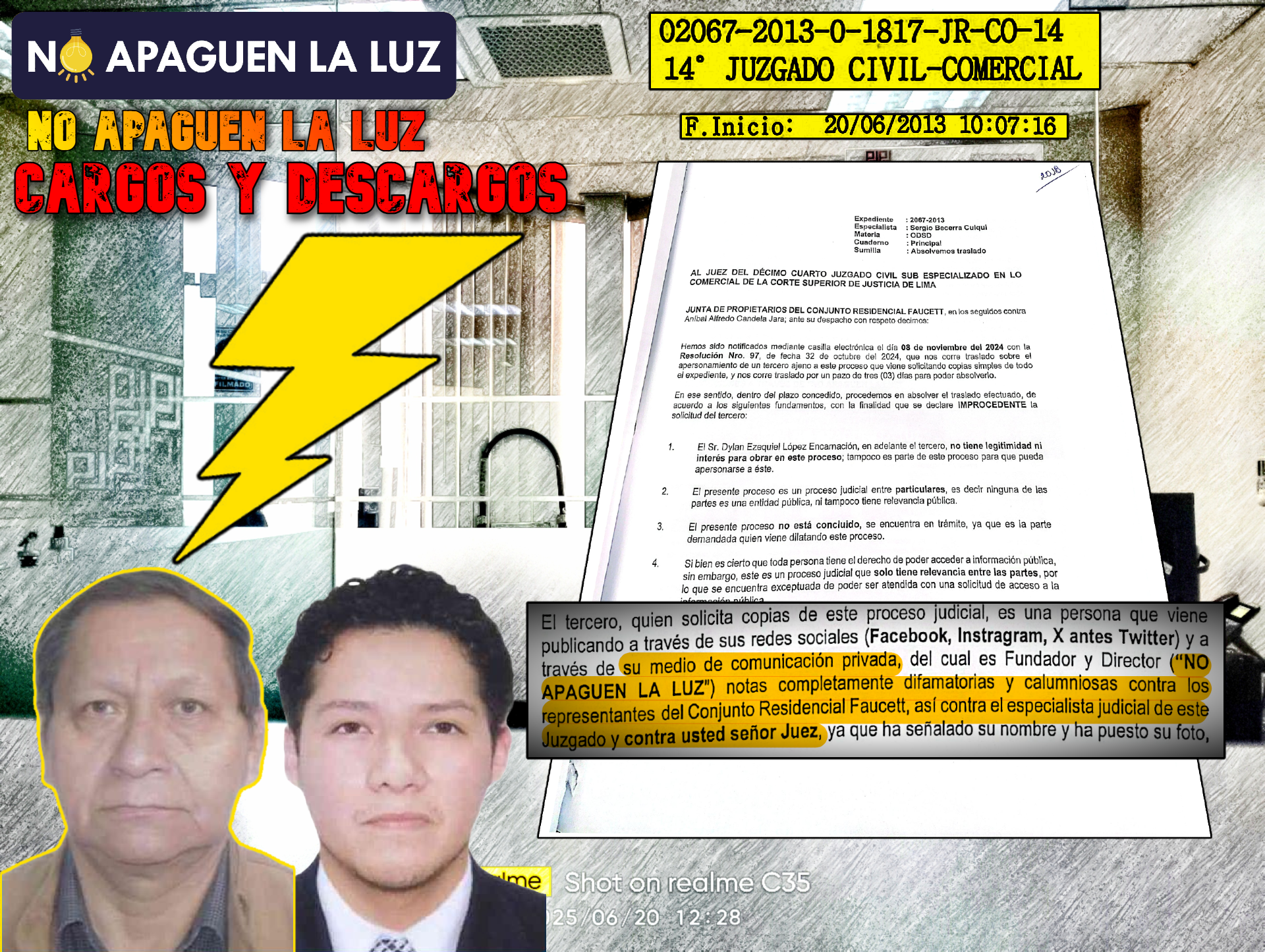 5.-  El tercero, quien solicita copias de este proceso judicial, es una persona que viene publicando a través de sus redes sociales (Facebook, Instragram, X antes Twitter) y a través de su medio de comunicación privada, del cual es Fundador y Director (“NO APAGUEN LA LUZ”) notas completamente difamatorias y calumniosas contra los representantes del Conjunto Residencial Faucett, asi contra el especialista judicial de este  Juzgado y contra usted señor Juez, ya que ha señalado su nombre y ha puesto su foto, haciendo dar a entender al público en general que hubo una supuesta colusión para favorecer a la parte demandante en este proceso, es decir viene desprestigiando su labor jurisdiccional, deshonrando a las personas sin tener el más mínimo grado de respeto hacia los demás.
