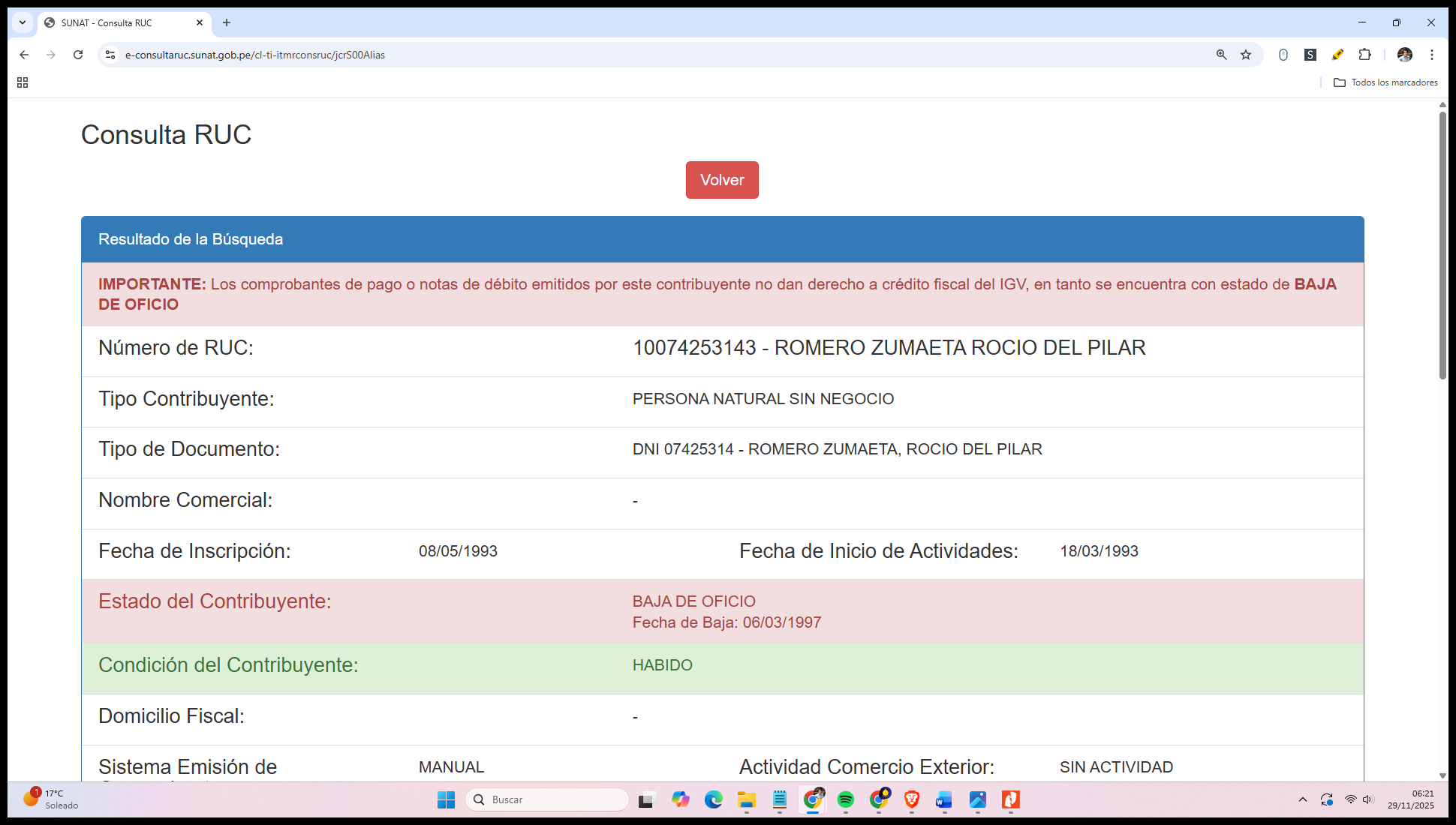Rocío Del Pilar ROMERO ZUMAETA como persona natural está de baja de oficio en la SUNAT desde el 06/03/1997.