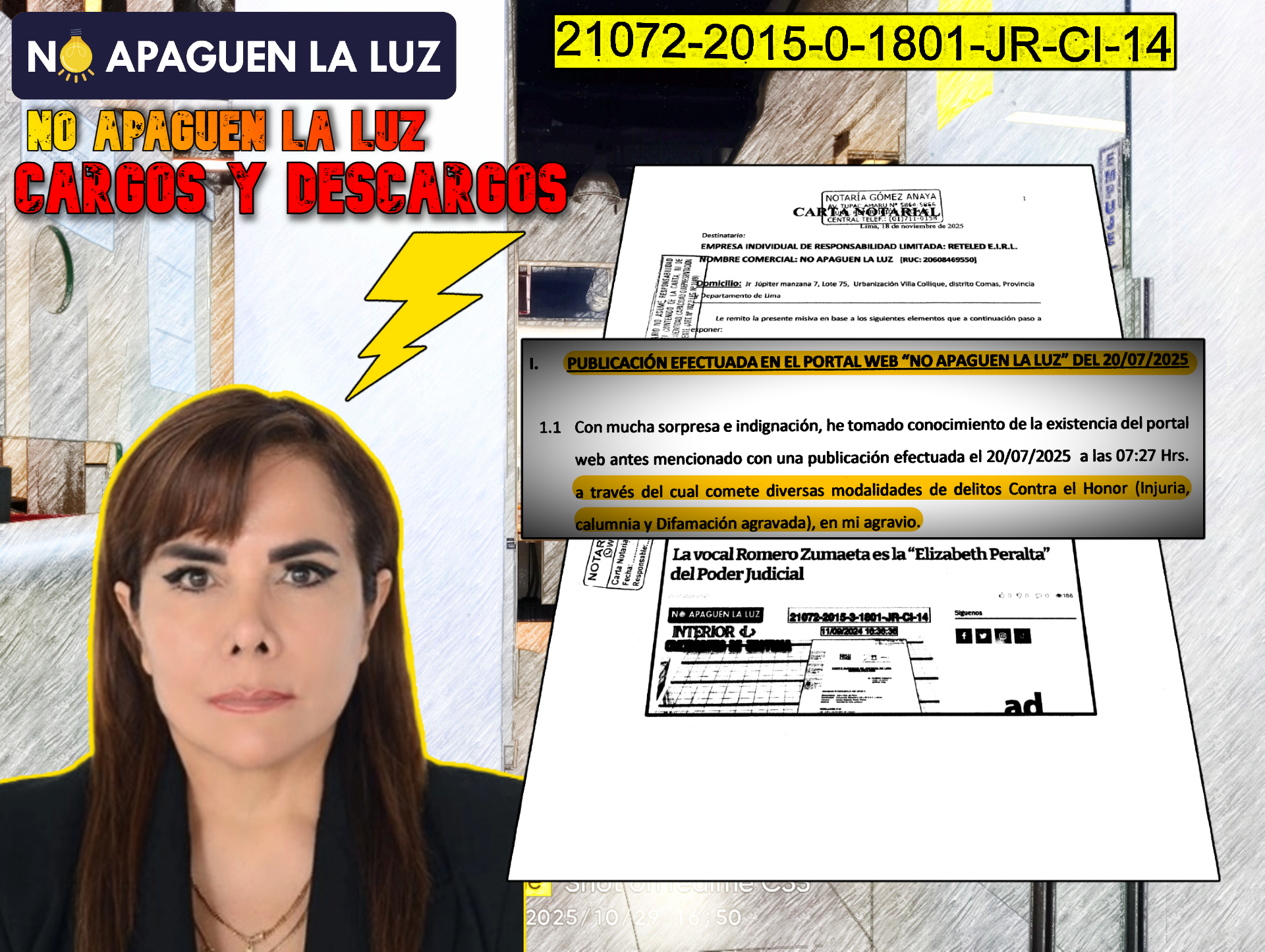 Al contrario de lo expresado por la jueza Rocío Del Pilar ROMERO ZUMAETA, en No Apaguen La Luz no estamos ni sorprendidos ni indignados con una comunicación notarial de una magistrada que preside una sala civil de Lima, para nosotros es un honor que recibamos una provocadora carta notarial; que se haya tomado el trabajo de escribirnos refleja indubitablemente que en el Poder Judicial nos leen y precisamente ese el objetivo de este modesto portal.