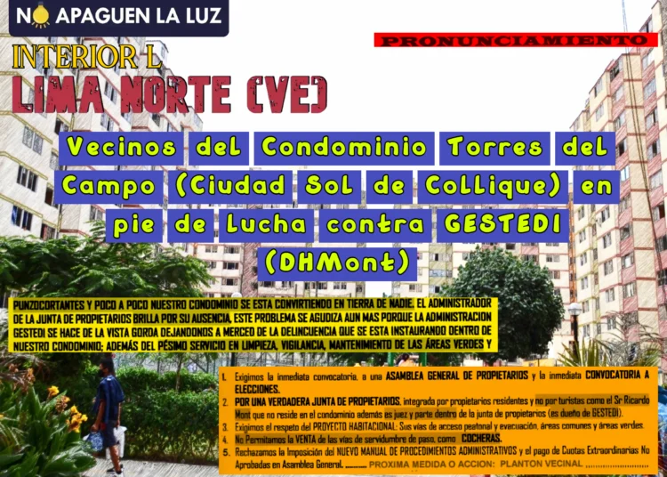 Compartimos en este espacio la denuncia pública de los vecinos de la Junta Vecinal de la Mz. F del condominio Torres del Campo, uno de los varios que hay al interior del proyecto inmobiliario Ciudad Sol El Retablo (antes llamado Ciudad Sol de Collique) quienes en una carta notarial suscrita por el secretario de actas de los delegados de la Mz. F – 1ra Etapa, junto con un grupo nutrido de firmas, se dirigen a Ricardo MONT LING, gerente general del Consorcio DHMont & CG & M S.A.C. y quien por medio de su empresa GESTEDI, saca la vuelta a la democracia en los edificios y está entornillado en la junta directiva desde la inauguración del Ciudad Sol de Collique el 2014, para directamente exhortarle y solicitarle convocar formalmente a una sesión de junta de propietarios a realizarse en el parque central del condominio y que como primer punto, ineludible, debe tratarse sobre la elección y conformación de un Comité Electoral para organizar un proceso de elecciones para el nombramiento y transferencia a la nueva junta directiva. Esto además de estar motivado en base al Reglamento Interno, es una reacción tras la ola de asaltos, intentos de secuestro, pandillas armadas al paso y de visita, amén del pésimo servicio en limpieza, vigilancia, mantenimiento de las áreas verdes y otras negligencias graves que afectan directamente a las familias que habitan los condominios.